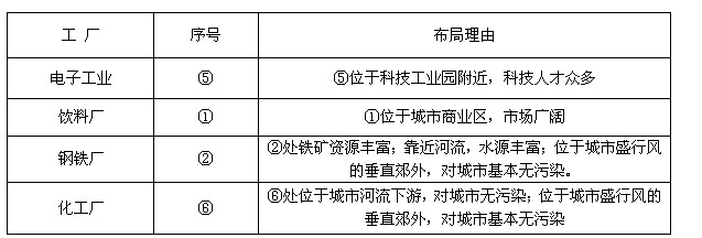 (1)计划在城市建设电子工业基地、饮料厂、钢铁厂、化工厂,请在下表中按要求填上适当内容