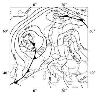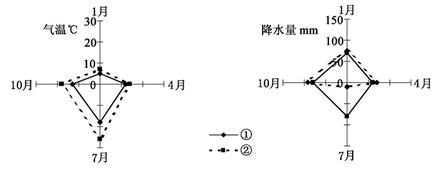 3、多选题 上图是2013年5月15日14:00欧洲部分地区海平面等压线分布图,下图是①、②两种气候类型的气温与降水量图。读图回答问题。