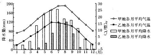 ? 我国甲、乙两地均位于29。N附近。读“1971~2000年甲、乙两地各月气温和降水量分布图”。读图,回答下题。