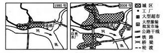 本题解析:本题考查区域发展和读图分析能力。 小题1:1980年城区主要沿河流呈带状延伸,2008年受铁路、公路吸引,城区向交通干线沿线拓展。 小题2:在2008年产业布局中,造纸厂位于城区,会造成严重的水污染。