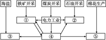 小题1:该工业地域的工业部门是在丰富的资源与农产品基础上发展起来的,根据工业部门之间有生产协作关系判断,①表示钢铁工业,④表示机械工业。