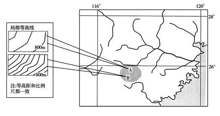 (2)读图中的左侧辅图分析,A地等高线比B地更为稀疏,说明坡度缓,物质迁移速度慢,水土流失少,泥沙沉积较多,土壤厚度更厚。土壤水分条件好,肥力更高。B地等高线密集,说明坡度大,水土流失多,土壤厚度小,肥力差。土壤水分条件差,肥力低。
