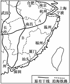 本题解析:本题考查我国铁路的分布、铁路建设的区位因素及意义等知识。第(l)题,根据A、B铁路的分布和经过的重要城市可知A为浙赣线、B为京九线。第(2)题,读图即可得出答案。第(3)题,京沪铁路经过的地区经济发达,人口稠密,客货流量大。第(4)题,提速主要是为了提高铁路的运输能力,缓解交通运输压力、带动沿线地区经济的发展。