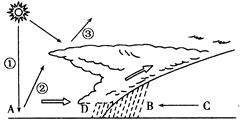 本题解析:本题考查天气系统的影响。(1)图示C位于冷气团一侧,而D位于暖气团一侧。A处天气晴朗,白天气温较高。(2)图示冷气团主动向暖气团进攻为冷锋。(3)冷锋形成北方夏季的暴雨,故我国西南地区受西南季风影响,东部地区受东南季风影响。