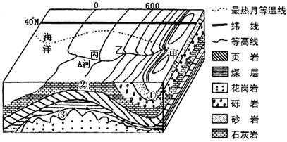 5、单选题  如图为40°N附近某地等高线地形图和海平面以下地层示意图。读图回答问题。
