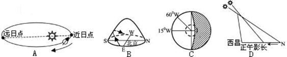 小题1:A图所示时间为1月后,C图为北半球夏半年,D图为冬至日后的太阳直射点移动情况,B图因为此时北半球昼短夜长,太阳从东南升起西南落下,视运动轨迹较短。故B正确。