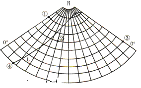 2、单选题 下图是局部地区经纬网图,图中相邻两条经线和纬线之间的度数差都是l0°,曲线L是2012年8月8日北京时间15:00时的晨昏线,读图回答下面各题。