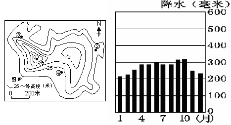 1、单选题 读太平洋中部某小岛等高线和降水季节分配柱状图,回答下列各题。