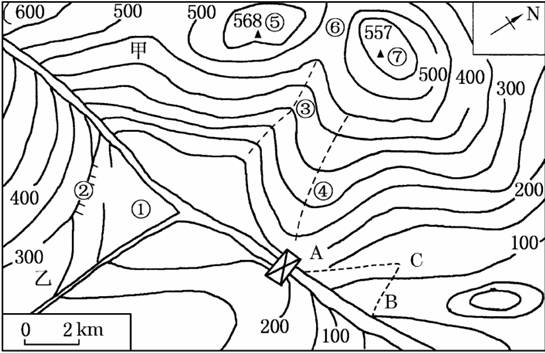 本题解析:1.本题考查的是等高线地形的相关知识点。由图可知,①处为该岛最高处,即为该岛的主峰,若要拍摄以该岛主峰为背景的照片,则应该站在坡度适当且中间没有其他山峰遮挡的位置。①为主峰峰顶,站在山顶照相照不到整个山峰,所以不能选①;②到主峰之间从图上可以看出也有一座山峰,所以会遮挡主峰,所以②不选;③处在主峰山脚下且中间没有其他山峰的遮挡,但是③处等高线较密集,可知此面山坡较陡,站在山脚下距山峰很近的位置很难拍到整个山峰,故③处也不理想;④到主峰之间没有其他山峰的遮挡,且此面山坡较缓,并且距主峰的距离适当,故站在④处可拍到整个主峰,故选D。