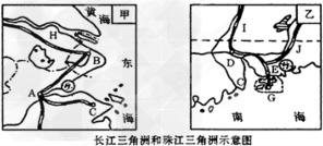 1、单选题 读我国两个三角洲图,并回答1-2题: