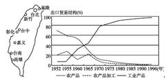 2、单选题 台湾是我国领土不可分割的一部分。读“台湾省主要工业中心及出口贸易结构变化图”,回答问题: