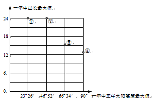 2、单选题 读四地一年中正午太阳高度最大值及昼长最大值图,完成下列各题。 |