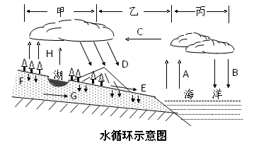 (1)从图中看水循环的箭头可知,这是海陆间的水循环,A从海上向上,是海水蒸发;B箭头向下,是海洋上降水(大气降水);C从海洋上空到陆地上空,是通过风等大气运动把水汽输送到陆地上空(水汽输送);D箭头向下,是陆地降水;E从地表到海洋,是地表径流;F是从地表到地下,是下渗;G是从地下到海洋,是地下径流。