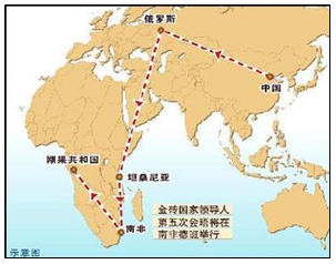 5、单选题 2013年3月22日至30日,中国新任国家主席习近平将访问俄罗斯、坦桑尼亚、南非和刚果共和国,并出席在南非德班举行的金砖国家领导人第五次会晤。这是习近平当选国家主席后的首次出访。读图完成下列各题。