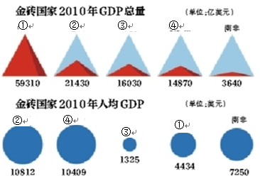 小题3:中国经济增长速度快,GDP总量仅次于美国,所以四国中GDP总量最高的①是中国,从口多,所以人均较少。印度人口与中国相近,GDP问题少,所以人均量最少③的是印度。俄罗斯与巴西接近,不易区分,但可以判断A对。B、C、D错。