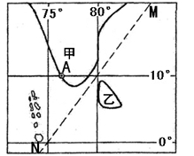 4、单选题 读“世界某区域轮廓图”,图中虚线MN为晨昏线,此时乙岛东北部降水量大于西南部。完成1-3题。