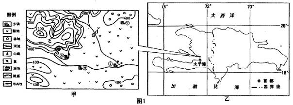 4、单选题 当地时间2010年1月12日下午海地发生7.3级强烈地震.位于首都太子港的总统府及多座其他政府建筑被震塌,包括外交部在内的多处通讯和电力供应中断,死亡人数可能超过20万人。此次地震震中位于北纬18.5度,西经72.5度,震源深度l3km,图1中甲图是该次地震震中附近等高线图。读图后回答l~3题。