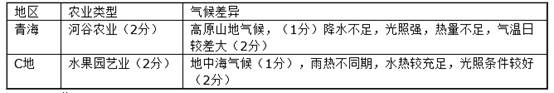 (3)比较图甲中我国青海省和图乙中C地种植业生产类型及气候条件的差异。(10分)