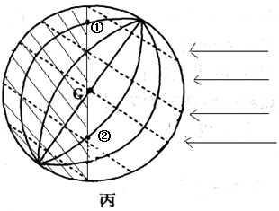 本题解析: 小题1:若AB为晨线,则AC为昏线,南极圈内出现极昼现象,日期为12月22日前后,太阳直射点的坐标为0°,23°26'S; 小题2:若DF为昏线,则DE为晨线,北极圈内出现极昼现象,此时为夏至日,此时北京时间为6月22日20时; 小题3:当甲图DF为昏线时,即太阳直射点在北回归线上,太阳光线注意是平行线,太阳光与晨昏线垂直; 小题4:丙图中,半球被经线分成6等份,相邻经线相差30°,即相差2小时,则可得到昼长为8小时的点①和夜长为4小时的点②如图; 小题5:最大限度地利用太阳光能,即太阳光与太阳能热水器的真空管平面垂直,因而真空管平面与楼顶面之间的夹角与正午太阳高度角互余,计算出当ED为晨线的这一天(6月22日)的32°N地区的正午太阳高度,则可得到太阳能热水器的真空管平面与楼顶面之间的夹角; 小题6:回顾教材可知,太阳能量来源于氢原子核的聚变反应; 小题7:太阳辐射是目前人类日常生活和生产所用的主要能量来源,但不是所有; 小题8:当E地的太阳高度达到一年中最大值时,即为夏至日,地球位于公转轨道的远日点附近,由波斯湾驶向马六甲海峡的船舶顺风顺水,巴西高原(南半球为冬季)一片枯萎,地中海沿岸河流进入枯水期。