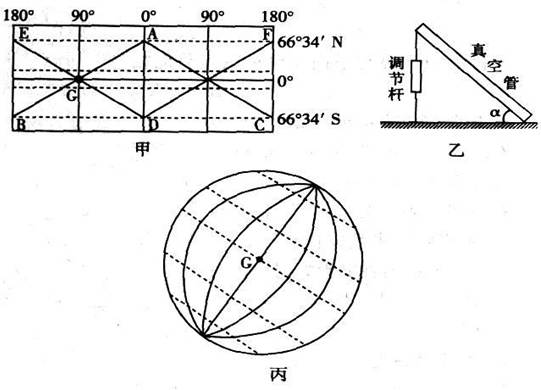 (1)若AB为晨线,日期为?月?日前后,太阳直射点的坐标为?。(8分) (2)若DF为昏线,此时为??(节气),此时北京时间为?月?日?时。(8分) (3)在丙图中绘出当甲图DF为昏线时的光照情况(绘太阳光线、晨昏线,并用斜线标出夜半球)。(3分) (4)在已绘好的丙图中,在晨昏线上准确标出昼长为8小时的点①和夜长为4小时的点②。(2分) (5)为了使32°N地区的太阳能热水器,最大限度地利用太阳光能,当ED为晨线的这一天,应将乙图中太阳能热水器的真空管平面与楼顶面之间的夹角调整为?。(3分) (6)太阳能量来源于(?)(2分) A.氢原子核的裂变反应?B.氦原子核的裂变反应 C.氢原子核的聚变反应?D.铀等放射性元素的衰变 (7)关于太阳辐射对地球的叙述,不正确的是( ?) (2分) A.太阳辐射是维持地表温度的主要热源? B.太阳辐射是促进地球上的水、大气、地壳、生物活动的主要动力 C.太阳辐射是目前人类日常生活和生产所用的所有能源 D.煤、石油等能源在形成过程中固定了大量的太阳辐射能 (8)当E地的太阳高度达到一年中最大值时,下列现象可能的是(?)(4分) A.地球位于公转轨道的远日点附近 B.由波斯湾驶向马六甲海峡的船舶顺风顺水? C.巴西高原一片葱绿 D.地中海沿岸河流进入汛期
