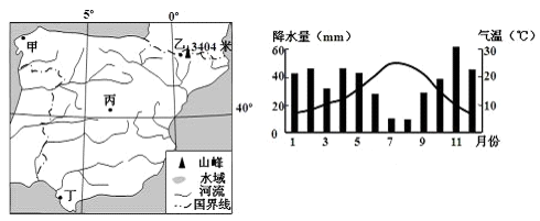 【小题1】根据②图中气温和降水分析,该地降水不到400mm,应该为大陆性气候,左图丙地位于半岛内部的高原地区,比其余三地降水要少,为大陆性气候。甲乙地位于西风带的迎风坡(岸)为温带海洋性气候,丁位于沿海,冬季降水较多,为地中海气候。故选C。