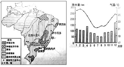 材料一:巴西土地利用示意和里约热内卢气候示意图。