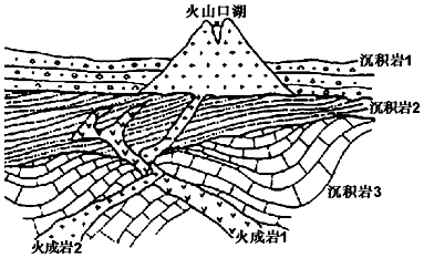 【小题1】沉积岩的新老关系可依据地层沉积顺序判断,一般上覆岩层较新,下部岩层较老;岩浆岩和沉积岩的新老关系一般依据切断关系判断,被切断的岩层较老。据此判读,图中沉积岩3、沉积岩2、沉积岩1依次由老到新;火成岩1切断了沉积岩2和沉积岩3,说明火成岩1较新;火成岩2切断了沉积岩3、沉积岩2和火成岩1,说明火成岩2较火成岩1新。