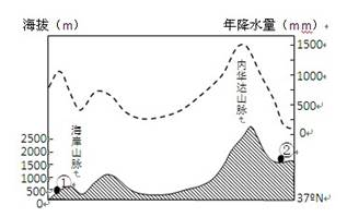 3.直接根据图示的地形剖面图和降水量分布判断,经图中海拔2000米刻度做水平线,相交地形剖面线于两点;过此两点作纵坐标的平行线,交年降水量线于另两点,则这两点所对应的年降水量刻度所示数值,就是两地的年降水量,其差值约为500 mm。