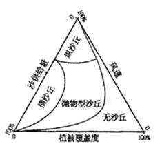 【小题2】走廊北部的沙漠有加速向南入侵趋势,由图示可以看出,横沙丘面积大,抛物型沙丘面积大,且横沙丘与抛物型沙丘的运动方向一致;沙漠南侵过程中,遇到植被阻拦,沙丘渐少,由于沙漠南侵植被沙化现象明显。选B正确。