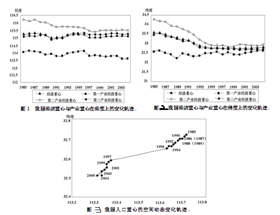 4、综合题 (14分)图1图2分别是1985-2004年我国经济重心与产业重心在经、纬度上的动态变化轨迹图;图3是1985-2004年我国人口重心的空间变化轨迹图。读图回答问题。