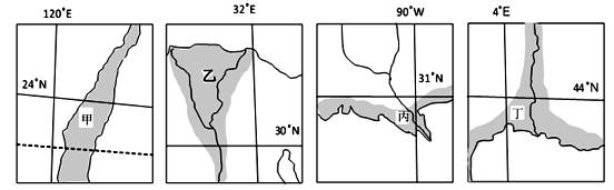 4、单选题 读图,阴影部分为四个农业区,完成问题。1.甲、乙、丙、丁的主要经济作物依次是2.四地的农业地域类型均属于