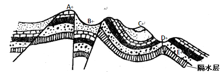 (2)A、B、C、D、E处的地层,从老到新的排列是?。