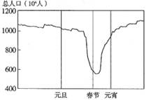 A.推进城市化进程 B.缓解城市就业压力 C.解决城市交通困境 D.改善城市住宅质量 参考答案: 本题解析:本题考查人口迁移。 本题难度:简单 2、单选题 右图为“我国某城市总人口的逐日变化示意图”(2008年11月28日~2009年3月8日),引起春节期间下图城市人口巨大变化的最主要原因是 参考答案:D 本题解析:从图上所给定的时间段(2008年11月28日~2009年3月8日)来,该城市的人口总数量在春节时人口数量集聚下降,说明这个城市的人口以外来人口为主,春节时大量的民返乡是造成这一现象的结果,并非什么疾病、洪涝等自然灾害在春节的突然爆发。也不可能是该的居民元旦、元宵节不去旅游而集中在春节几乎全城出动去旅行度假,故选D 本题难度:一般 3、单选题 改革开放后,随着我国社会经济的发展,人口迁移日趋频繁。完成下列小题。 |