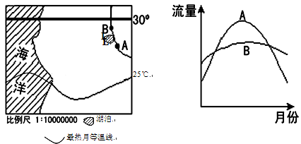 【小题2】图示区域为地中海气候,此时降水少,河流为枯水期,湖泊水补给河流水,C对,D错;湖泊对河流水量具有调节作用,当河流经过湖泊时流量变平稳,图中B河段流量变化幅度小故河流应从A流向B,自南向北流,所以选B、C项。