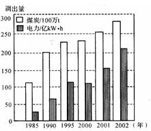 5、单选题 图为山西省能源调出结构变化图(注:2002年1吨煤的平均价格为160多元;1吨煤可发电2500千瓦时;山西省向外输电的价格为0.245元/千瓦时;同时,输煤需要建设铁路、公路等交通设施),完成下列各题。