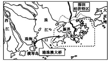 5、综合题 (18分)?阅读材料,回答下列问题。 材料一 中新网2010年10月11日电 据香港大公报报道,港珠澳大桥主体工程建设全面启动,该大桥将于2015年至2016年建成通车。这是在“一国两制”条件下,粤港澳三地首次合作建设的大型基础设施。港珠澳大桥对促进香港、澳门和珠江三角洲地区经济的进一步发展具有重要的意义。 材料二