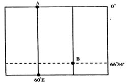 3、单选题 下右图中相邻两条经线的经度差为30度,A、B为晨昏线上的两点,大阳直射在东半球。据此完成下列问题。