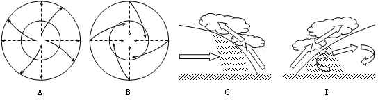 【小题1】从天气预报的有关数据可以看出,该地经历了气温降低和阴雨天气的过程,说明受冷锋影响。A、B分别表示反气旋和气旋;C、D表示锋,两图中锋面下方均为冷气团,其中C图中冷气团一直向前,方向没有发生逆转,说明冷气团势力强盛,为冷锋。