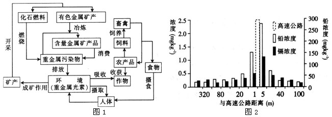 1、综合题 重金属污染物对人体健康危害巨大。图1为重金属污染物进入人体的路径示意图,图2为某高速公路两侧土壤中铅、镉浓度示意图。读图回答问题。