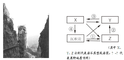 4、单选题 下图是浙江省乐清市境内的雁荡山,素有“寰中绝胜”“海上名山”之誉。史称”东南第一山”。现代地质学研究表明,雁荡山是一座具有世界意义的典型的白垩纪流纹质古火山,经过抬升、切割、剥蚀,导致火山根部天然裸露成多方位立体断面模型。结合图 “地壳物质循环简图”,完成下列问题。