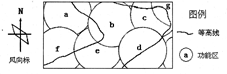 本题解析:本题考查城市功能区的分化和读图分析能力。 小题1:若城市功能分区合理,则市中心应该布局商业区;工业区应该布局在城市外围,且不能造成对城市的严重污染。结合风向标图,该地主要风向为西北风和东南风,工业区应该建在与主导风向垂直的郊外,即东北部和西南部;再结合等高线可知该城市的河流流向为自东北流向,西南工业区应位于河流的下游,则图中f最有可能是工业区。 小题2:g附近有河流经过地势较高,且远离工业区,而环境条件好于a。