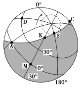 参考答案:B 本题解析:本题考查晨昏线图的综合判断。图示自转方向呈逆时针,判断为北极上空俯视图;图示晨昏线与极圈相切,北极地区出现极昼,判断太阳直射点位于北半球,故越往北,昼越长,故B正确。图示顺着自转方向经过M点即将进入夜半球,判断为昏线;图示太阳直射点位于北回归线以南,故M点第正午太阳高度大于N点。 本题难度:一般 3、单选题 读12月22日光照图(阴影表示夜),回答问题。 参考答案:(1)二 9 本题解析:本题考查光照图的综合判断。 本题难度:一般 4、单选题 读①②③④四地年内昼长变化曲线图,回答下列题。 |