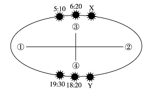 3、单选题 下图为“我国某地二分、二至日出、日落时刻(北京时间)的太阳位置示意图”,①②③④代表方位。读图完成下列问题。