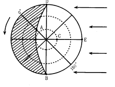 (4)当地球上的昼夜状况如右图中所示时, A、B、C三地正午太阳高度从大到小的排列顺序是 ;A、B、C三地黑夜由长至短排列顺序是 。(4分)