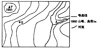 【小题1】图中的等高距为200米,最高处山顶海拔是1860米,Q点与P点间隔四条等高线,说明相差800米,那么1860-800=1060米,在选择中D最接近该海拔高度,所以D正确。