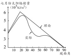 本题解析:1.根据图示,该坡7月获得的太阳辐射量较多,为阳坡,但是在坡度40°附近实际获得小于理论太阳辐射量,可见该坡度可能阴天多,降水多。所以为向阳坡,迎风坡。所以本题选择A选项。