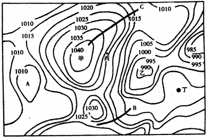 本题解析:(1)图示乙处就其气压状况而言,为低压,但从气流状况看,属于气旋;北半球气旋,结合地转偏向力向右偏画图判断为逆时针旋转。(2)根据等值线高于高值、低于低值的原理分析,甲地气压1040—1045;乙地气压985—990,故计算两地的气压差为50—60之间,故最大值应接近60,选A项。(3)图示丙地等压线较密集,水平气压梯度力较大,风力较大。(4)图示B位于低压槽可能形成锋面,而C处为高压脊,气流辐散,不可能形成锋面。