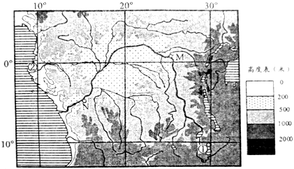 2、单选题 刚果河以图中M、N两地为界,分为上、中、下游,读图回答下列各题。