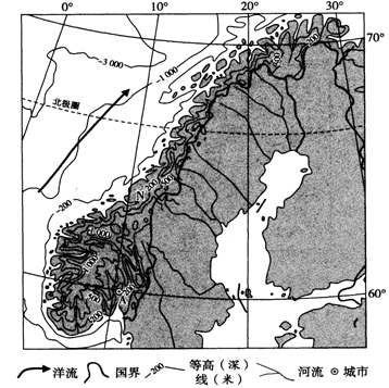 参考答案: (1)降水丰富且季节分配均匀,河流流量较大且稳定(2分);地形以山地为主,地势起伏较大,河流落差较大,水能资源丰富(2分);经济发达,能源需求量大(2分);科技水平高,水能开发利用技术成熟(2分);水能属于可再生能源,且水电清洁无污染(2分)。 (2)该国纬度较高,光热不足(2分);地形以山地为主,平原面积狭小,不适宜大面积发展粮食种植(2分)。 (3)水域开阔且深,有良好的航行与停泊条件(2分);受北大西洋暖流增温影响,终年不封冻(2分);陆域较开阔平坦,有良好筑港条件(2分);城市经济发达,成为港口发展的重要依托(2分);有公路、铁路等运输联系国内腹地(2分)。