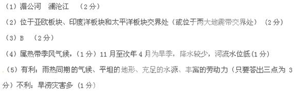(6)中南半岛的地形特征是??,城市主要分布在?,其分布的有利条件?(5分)